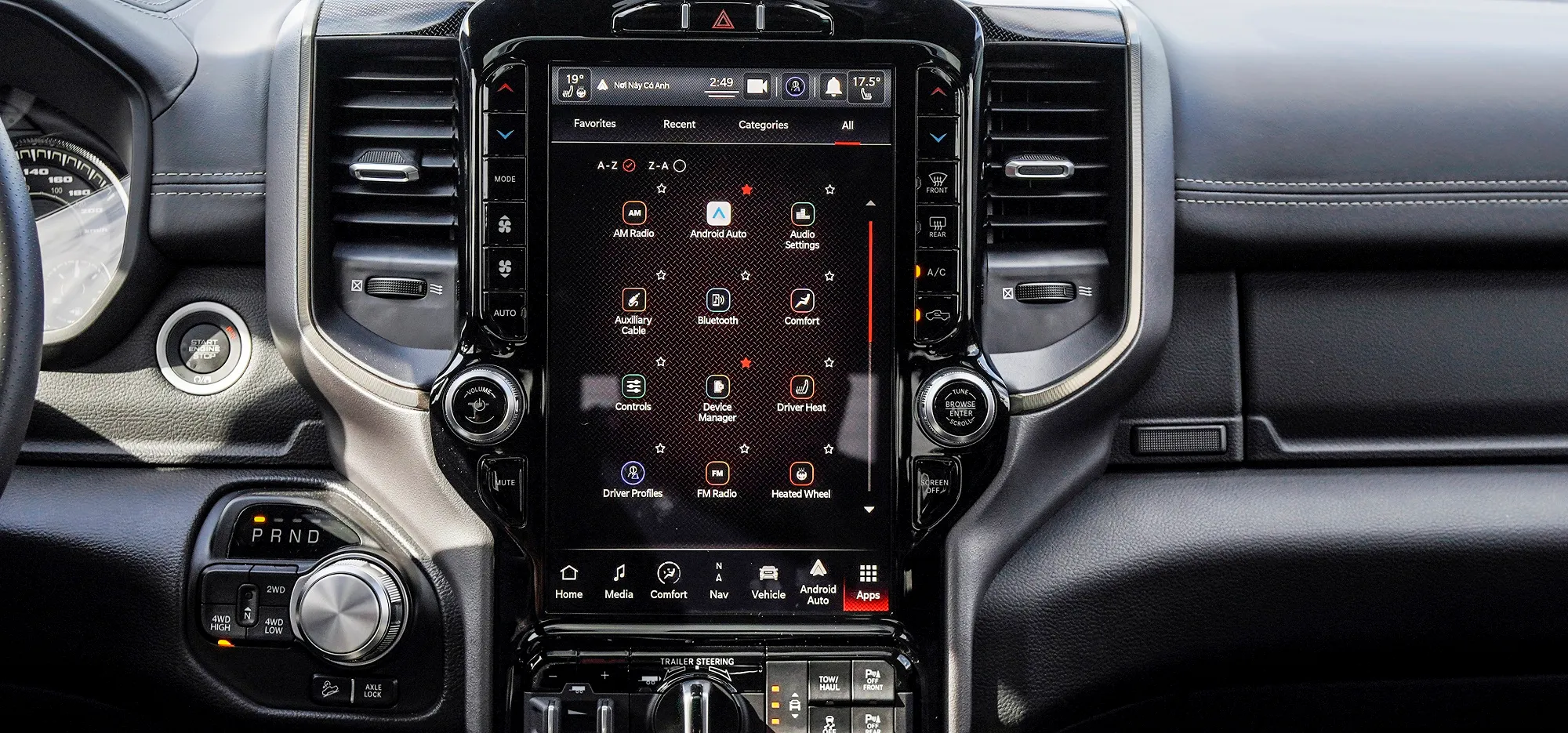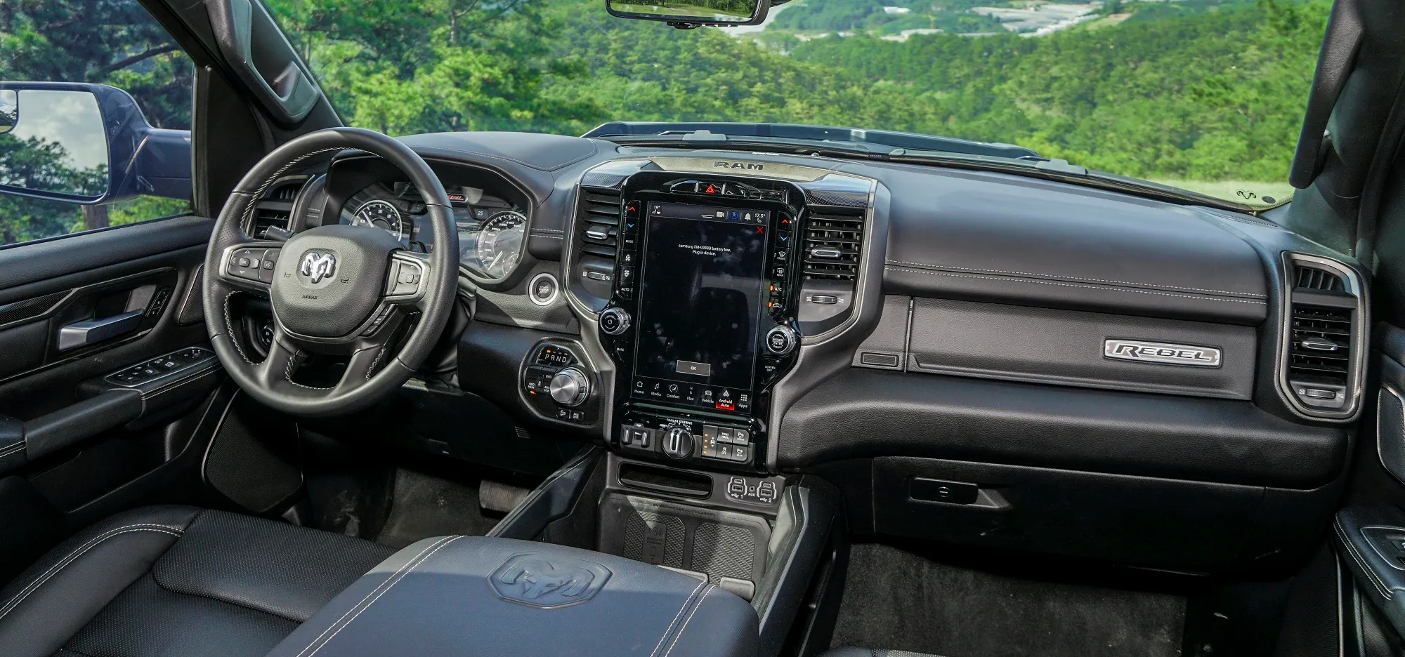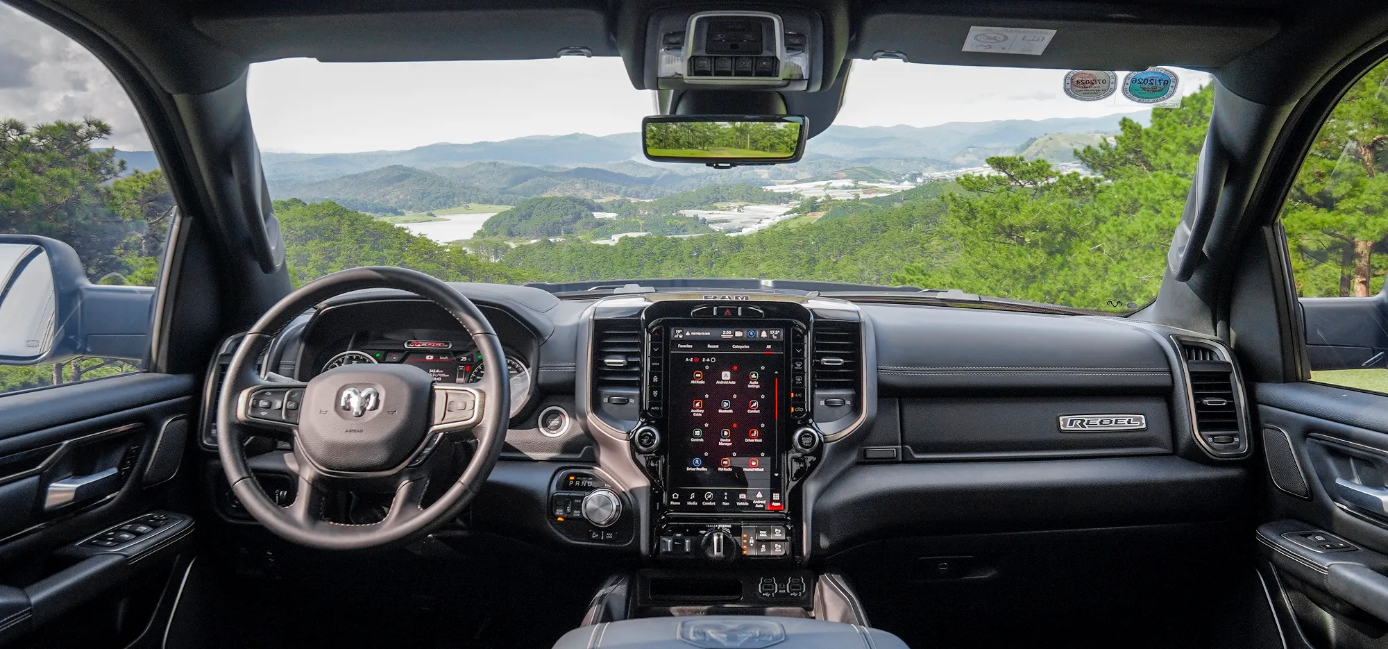 Tại trung tâm taplo RAM 1500 Rebel sử dụng màn hình cảm ứng U-Connect đặt dọc, kích thước 12 inch, hỗ trợ Apple CarPlay/Android Auto. Hai bên màn hình giải trí của xe là hệ thống cửa gió điều hòa lớn cùng hệ thống nút bấm và núm xoay cơ điều khiển chức năng phía dưới.