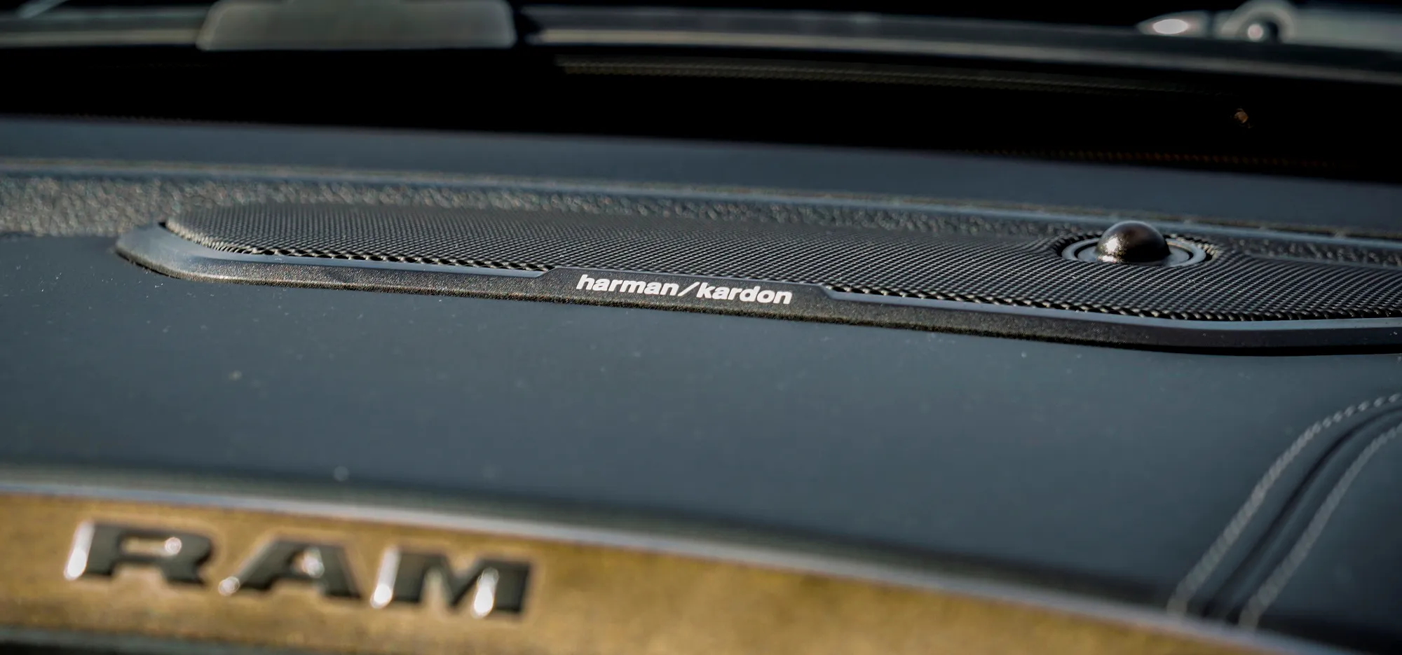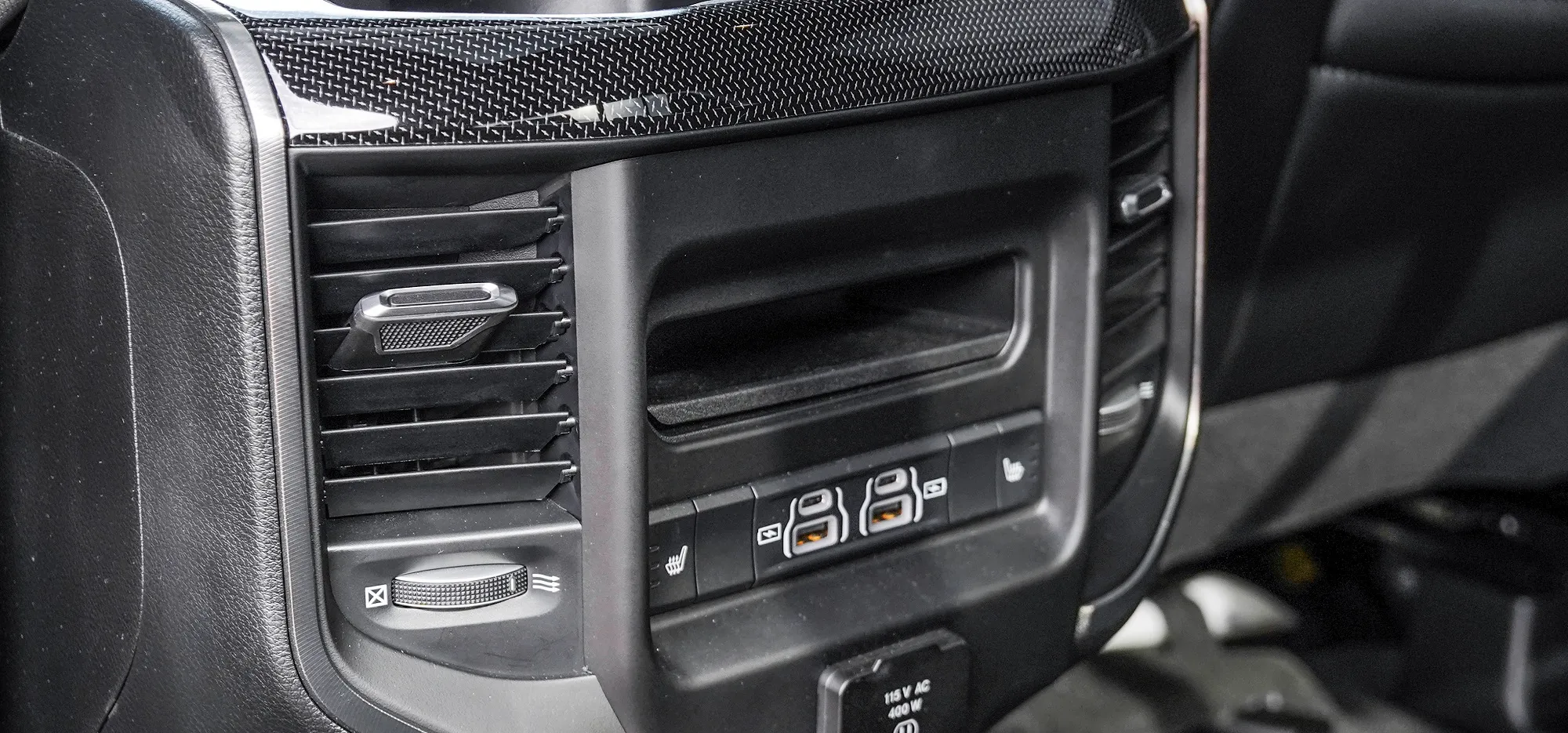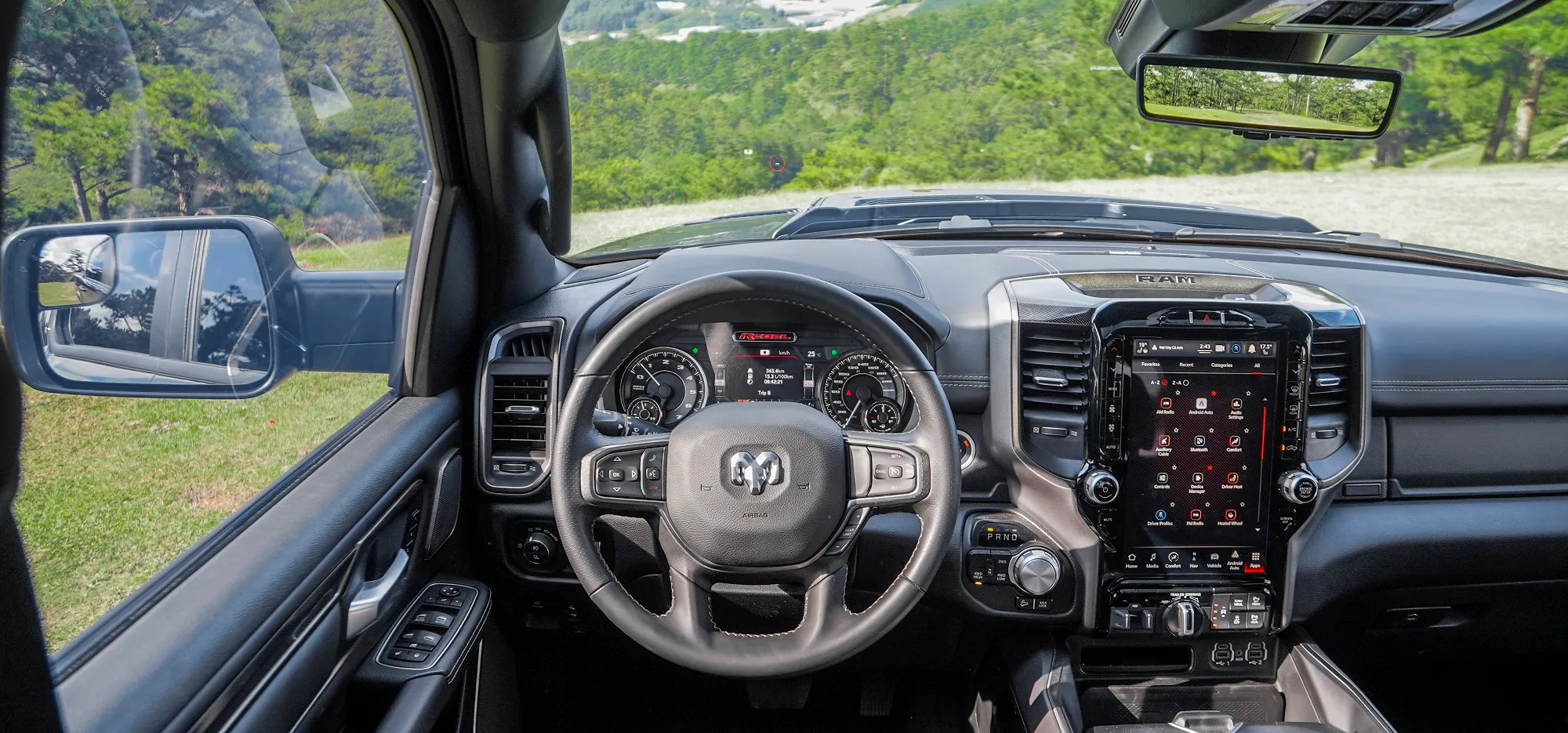 Tại trung tâm taplo RAM 1500 Rebel sử dụng màn hình cảm ứng U-Connect đặt dọc, kích thước 12 inch, hỗ trợ Apple CarPlay/Android Auto. Hai bên màn hình giải trí của xe là hệ thống cửa gió điều hòa lớn cùng hệ thống nút bấm và núm xoay cơ điều khiển chức năng phía dưới.