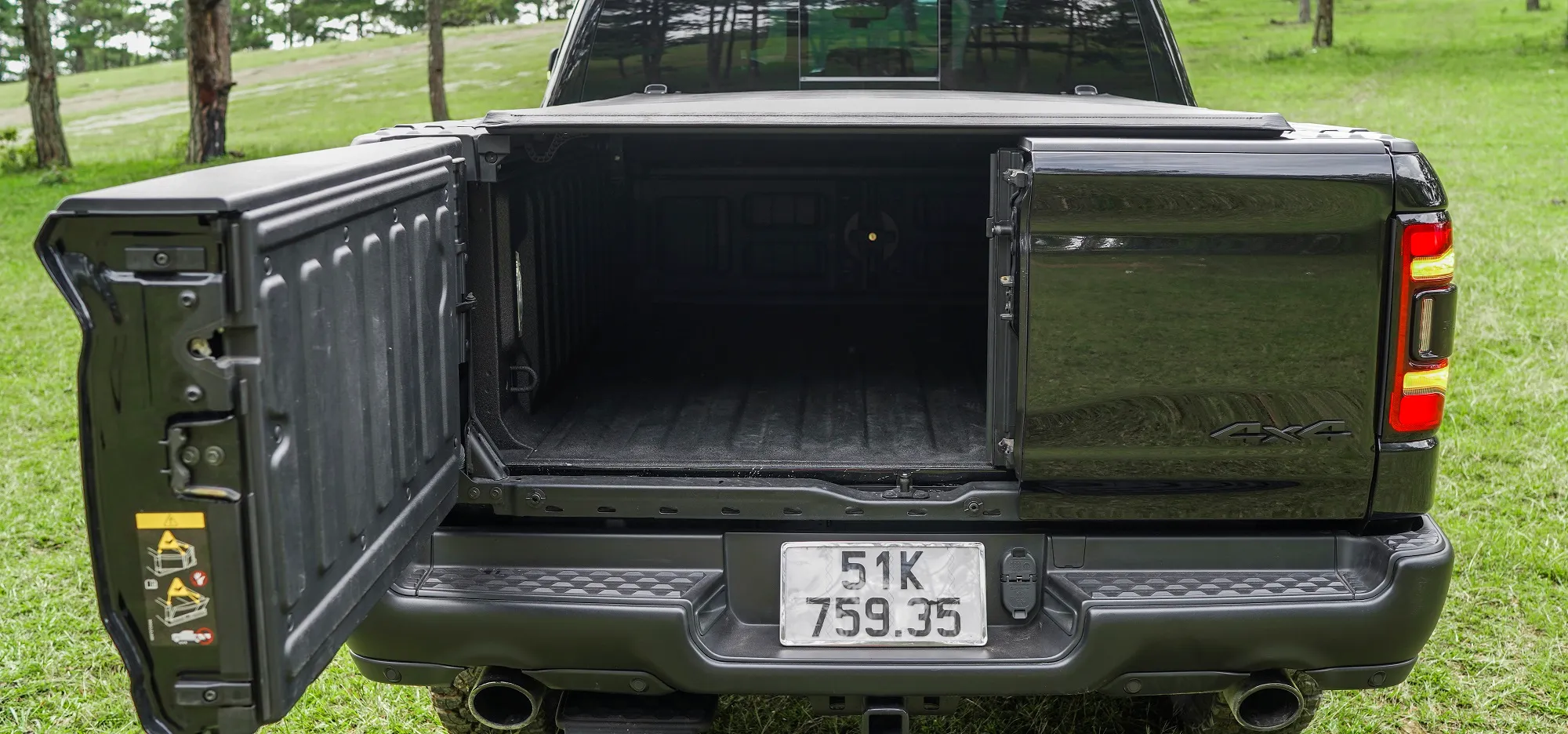 Mẫu xe bán tải cỡ lớn này còn được trang bị bệ lên xuống thùng xe phía sau riêng. Liền kề phía dưới, cản sau xe sơn đen kết hợp cùng cặp ống xả viền ngoài mạ crom sáng thu hút. Ngoài ra, RAM 1500 Rebel còn được trang bị cả móc kéo phía sau, các giắc cắm điện cho rơ-moóc.