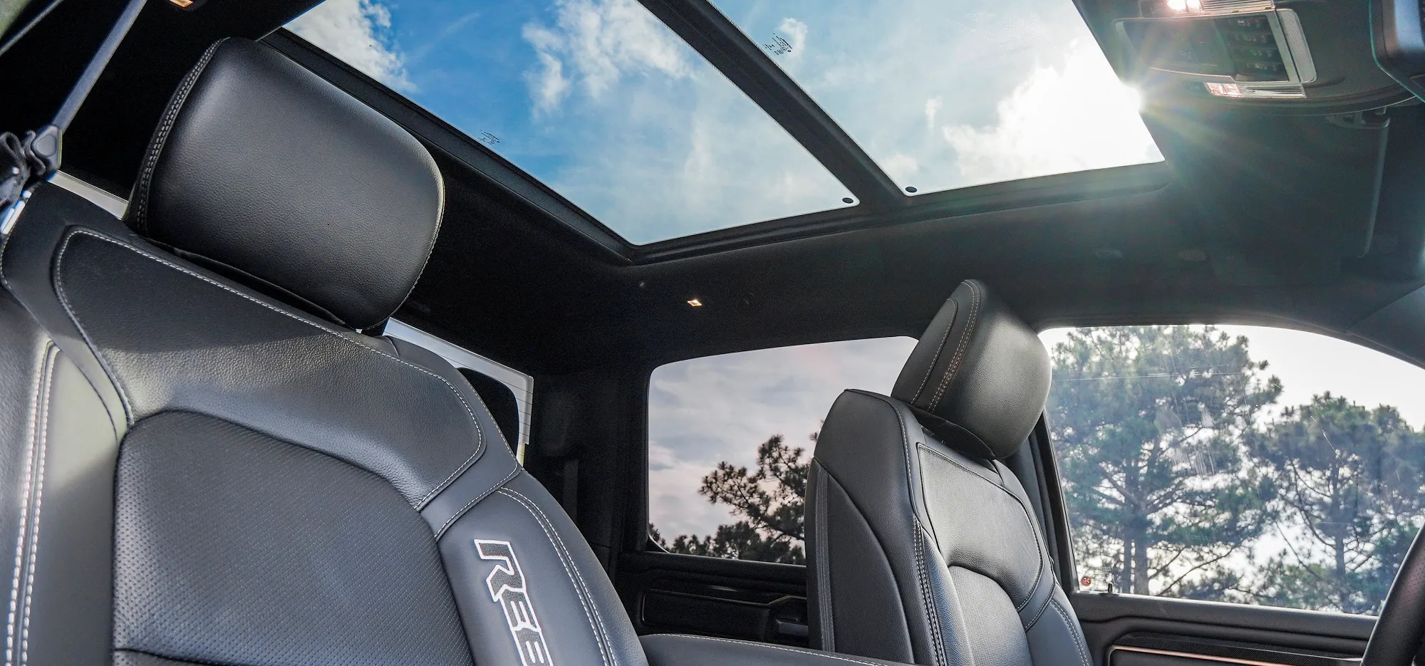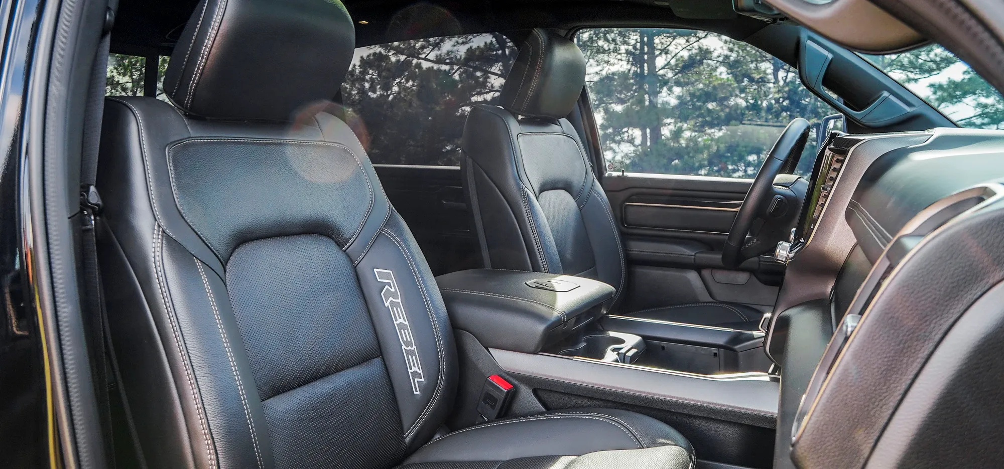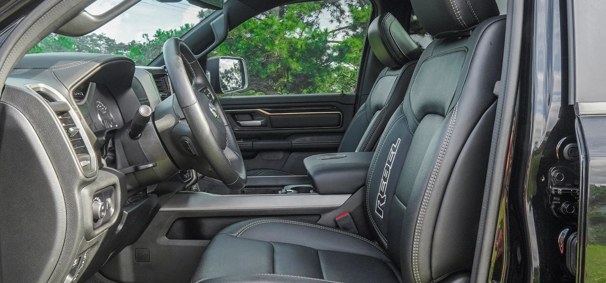 Hệ thống ghế ngồi trên RAM 1500 Rebel bọc da chắc chắn, bề mặt ghế có đường chỉ khâu màu trắng nổi bật. Bên hông ghế trước được thêu dòng chữ “Rebel” tạo điểm nhấn, phân biệt giữa các phiên bản. Ghế xe còn được tích hợp tính năng thông gió, sưởi ghế hiện đại và khả năng chỉnh điện.